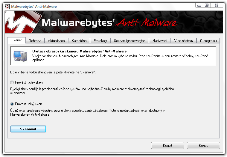 Malwarebytes Anti-Malware je výkonný program na rýchlu detekciu a odstraňovanie takmer každého škodlivého softvéru. Nie je to náhrada za antivírusový program, skôr sa to dá použiť ako doplnok k antivírusu. Je to kvalitný program, ktorý dokáže v rýchlo a pri malom zaťažení vášho počítača (procesora a pamäte) nájsť mnohé škodlivé objekty, ktoré iné aplikácie nájsť nedokážu. Pri práci s programom môžete používať režim rýchleho skenovania ktorý zaručí prehľadanie počítača na základné typy malwaru. Tento test trvá len niekoľko málo minút. Úplný sken umožňuje vybrať diskové oddiely (vrátane externých diskov a sieťových úložísk), ktoré sa majú prehľadať. Potom na nich hľadá podrobne všetky druhy malwaru, ktoré má v databáze. Pred spustením skenovania by ste mali na tretej záložke skontrolovať aktuálnosť vašej verzie aplikácie a stiahnuť najnovšiu aktualizáciu databáze škodlivých programov.