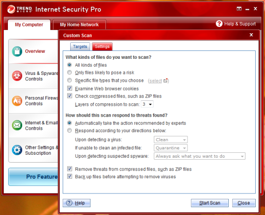 Trend Micro Internet Security patrí do tej skupiny antivírusov, ktoré sú dostupné aj u nás. Tento profesionálny bezpečnostný balík je trošku ťažšie zaradiť do antivírusových testov, totiž Trend Micro sa nezúčastňuje na veľkých testoch, kde sú konkurenčné produkty pravidelne porovnávané. Zaujímavé je, že na testoch stránky www.matousec.com dosahuje celkom uspokojivé výsledky. Pre cestovateľov ponúka aj preverenie WiFi hotspotov z hľadiska bezpečnosti. Niektoré funkcie, ktoré sú vo vlastnostiach uvedené ako významné obsahujú už nové operačné systémy, takže výhodou je iba to, že k týmto funkciám je prístup z prostredia antivírusu. Funkcie na čistenie a optimalizáciu systémových registrov a sľub zvýšenia výkonu sú takým doplnkom, ktorý asi pri výbere nezaváži.
